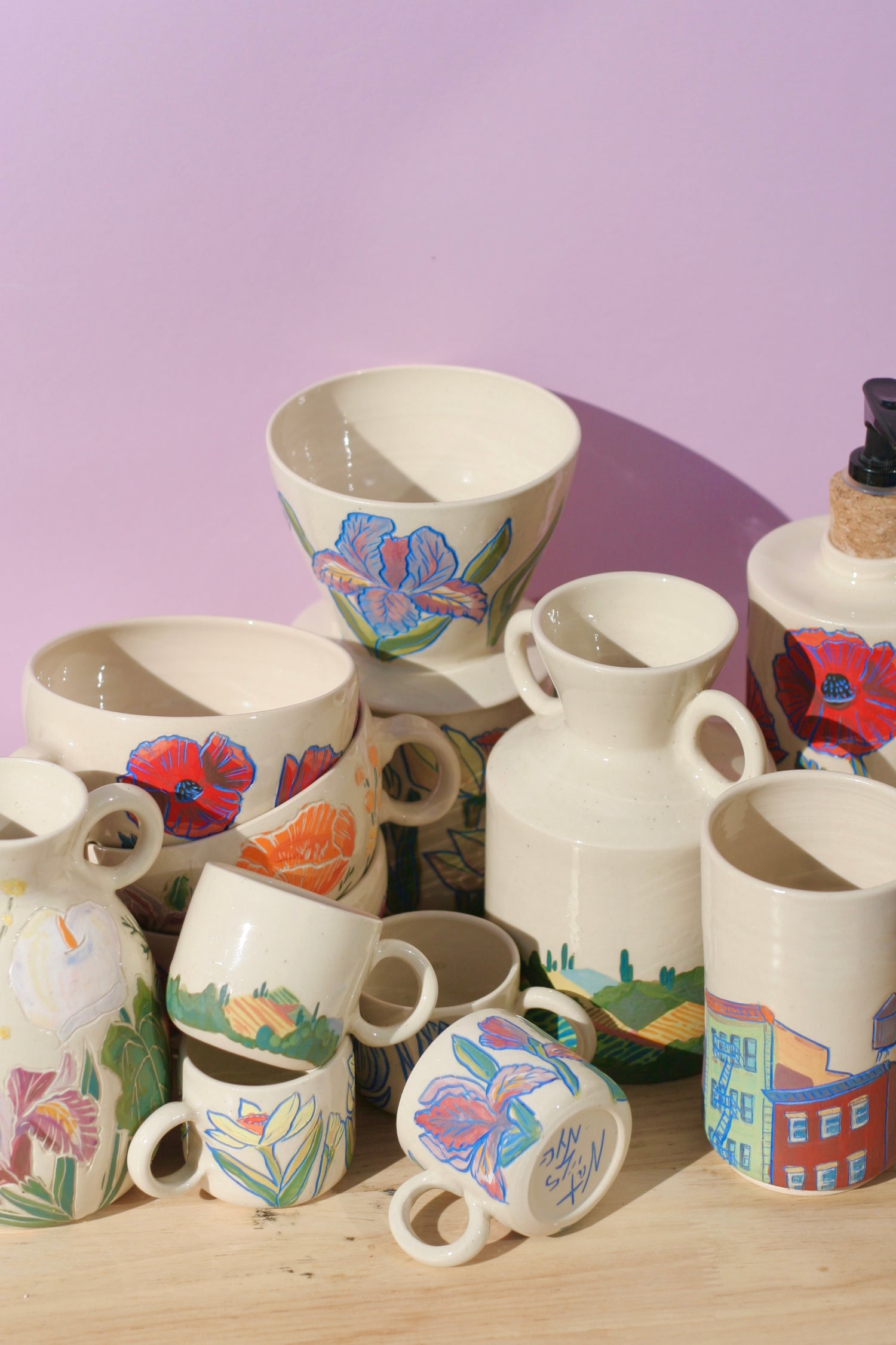 She had always been a painter--watercolor, theater sets, whatever she could get her hands on. So after moving to ceramics, it only made sense to hand paint all of her pieces.